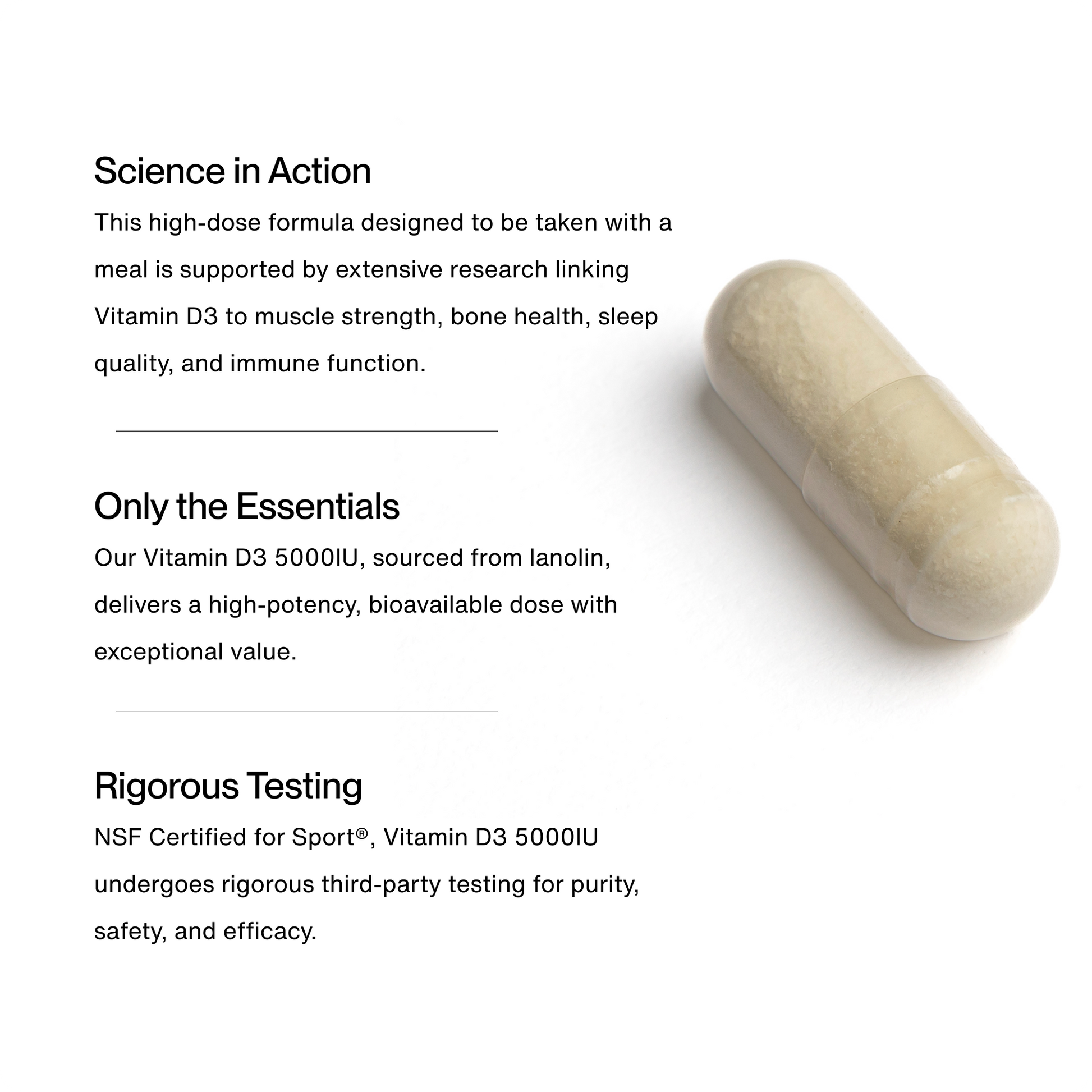 Sourced from lanolin, our D3 5000 IU is ideal for those needing a stronger daily dose to meet their health and performance goals. It’s a simple but powerful tool for maintaining energy, resilience, and recovery.